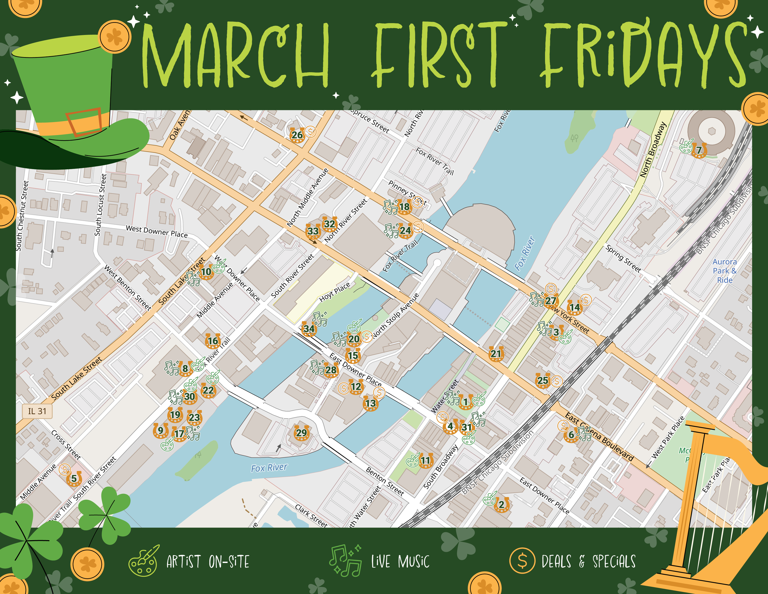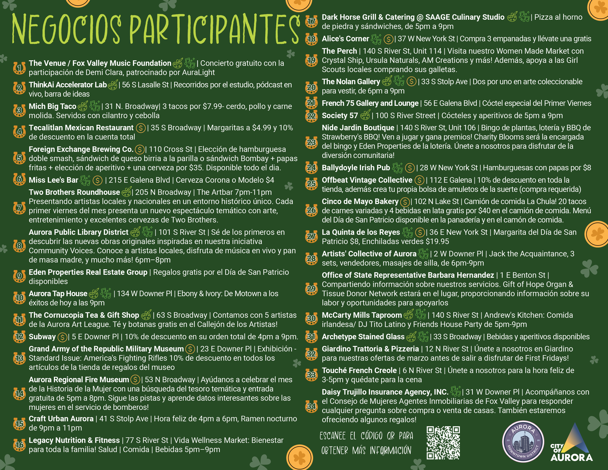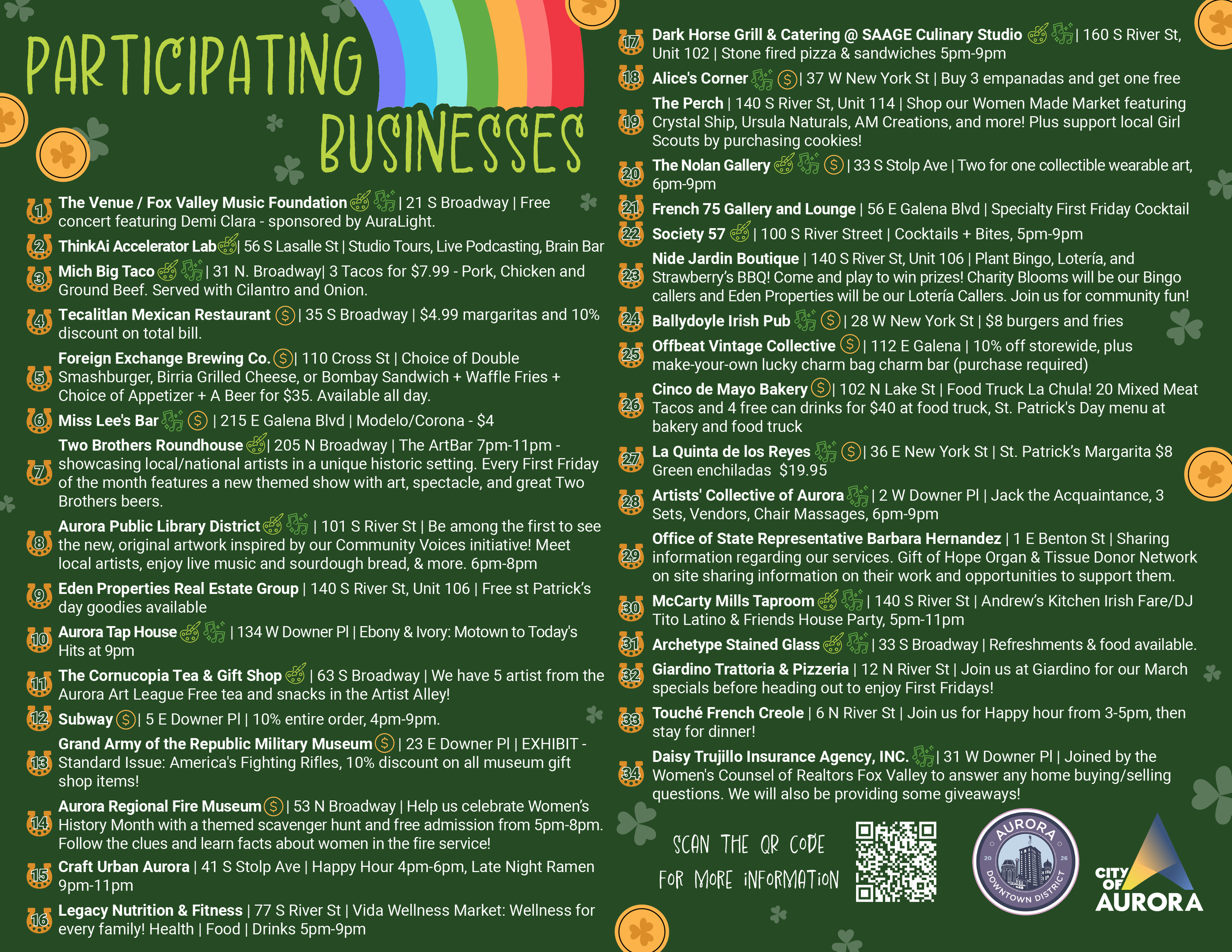 Do you own/manage a business in Aurora Downtown and want to be a participating First Fridays location? You must sign up by the 15th of the prior month. Registration for March is closed.